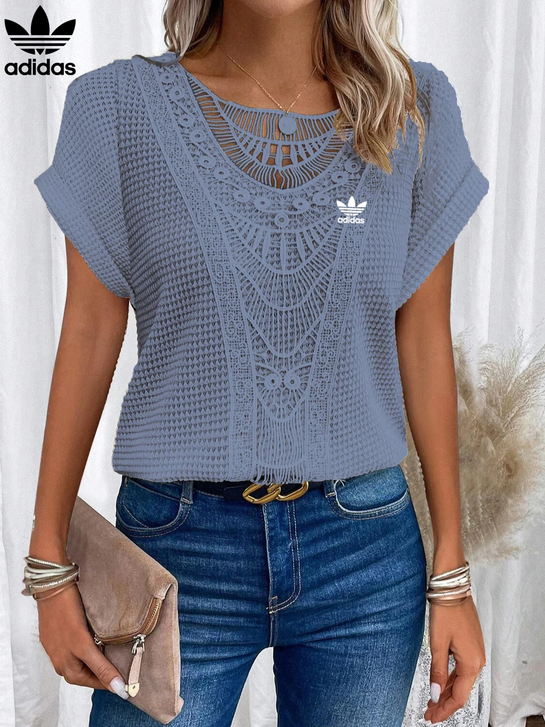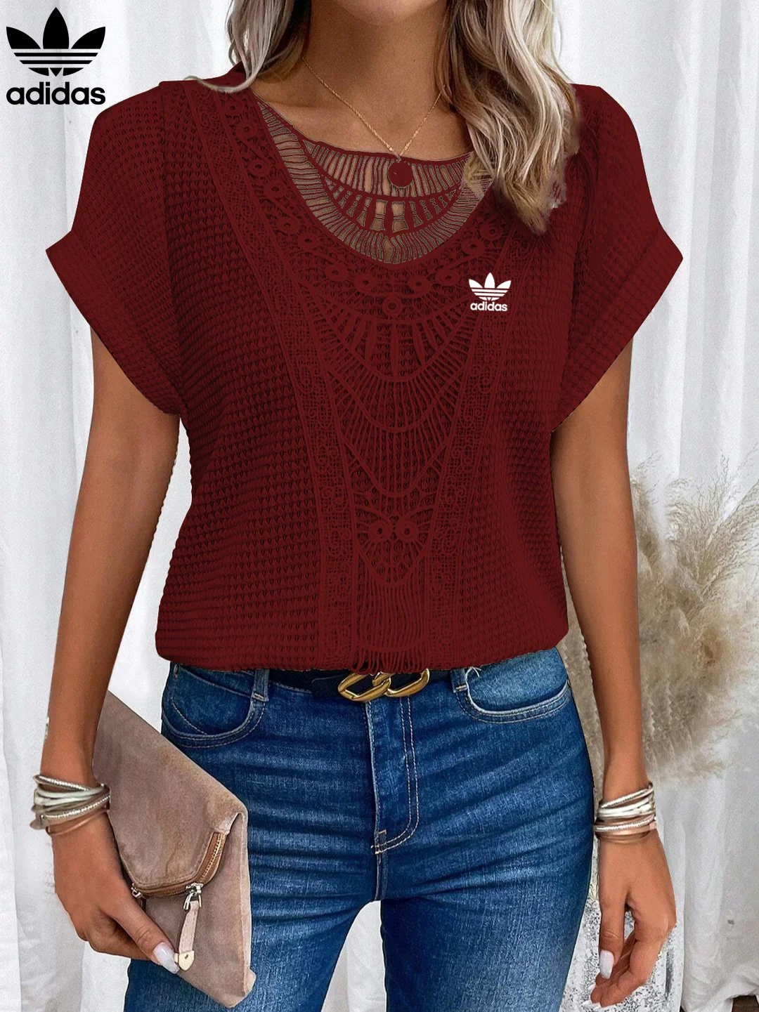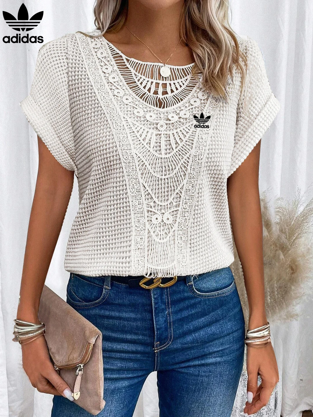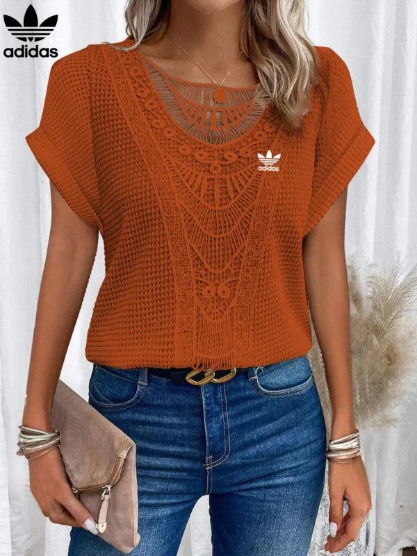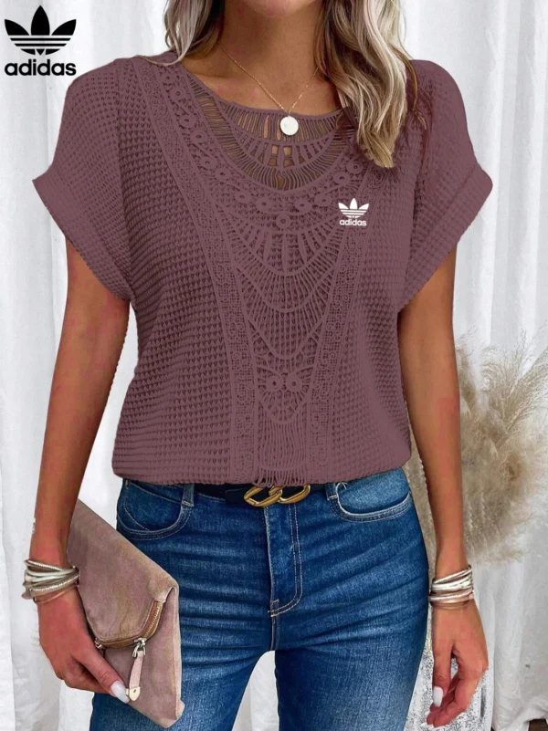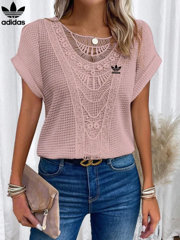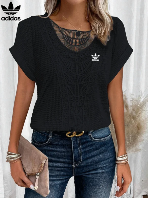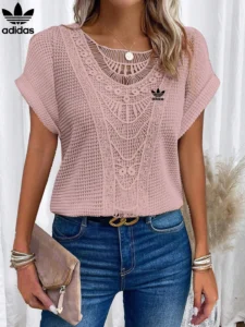 Add a graceful finish to your everyday wardrobe with the Adidas – New Trendy T-Shirt. Featuring intricate lace accents across the neckline and front, this piece brings a soft romantic charm to a flattering, easy-to-wear silhouette. Whether paired with denim or dressed up with a skirt, it’s your go-to for elevated casualwear.